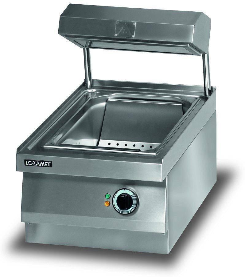 Standardowe wykonanie: • Wymiary: 400 x 650 x 270 / 300 mm • Wymiary z podstawą: 400 x 650 x 900 mm • Zbiornik GN 1/1, głębokość 200 mm • Siatka ociekowa • Promiennikowy panel grzejny • Zasilanie elektryczne: ~ 230 V, 50 Hz • Wymagane zabezpieczenie instalacji: 6 A • Moc: 1,1 kW • Regulacja temperatury podgrzewania