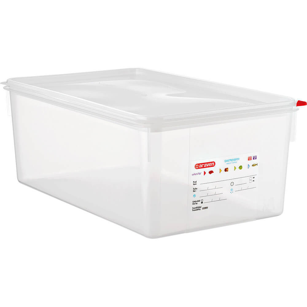 Pojemnik GN 1/1 HACCP z polipropylenu z pokrywką. Pojemnik wykonany jest z półprzezroczystego polipropylenu nie absorbującego zapachów wolnego od Bisfenolu. Pojemnik wyposażony jest system ColorClip, jest to zestaw kolorowych klipsów do oznaczania pokrywy i pojemnika w zależności od produktów w nim przechowywanych. Pojemnik wyposażony jest w etykietę ułatwiającą spełnianie norm HACCP, do wypełnienia markerem zmywalnym w zmywarce lub 96% spirytusem. Pojemniki charakteryzują się odpornością termiczna od -40 do 95oC. Pojemniki GN można piętrować dzięki czemu zajmują mniej miejsca podczas przechowywania. Nadają się do używania w kuchenkach mikrofalowych oraz mycia w zmywarkach gastronomicznych.