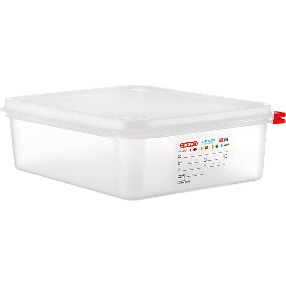 Pojemnik GN 1/2 HACCP z polipropylenu z pokrywką. Pojemnik wykonany jest z półprzezroczystego polipropylenu nie absorbującego zapachów wolnego od Bisfenolu. Pojemnik wyposażony jest system ColorClip, jest to zestaw kolorowych klipsów do oznaczania pokrywy i pojemnika w zależności od produktów w nim przechowywanych. Pojemnik wyposażony jest w etykietę ułatwiającą spełnianie norm HACCP, do wypełnienia markerem zmywalnym w zmywarce lub 96% spirytusem. Pojemniki charakteryzują się odpornością termiczna od -40 do 95oC. Pojemniki GN można piętrować dzięki czemu zajmują mniej miejsca podczas przechowywania. Nadają się do używania w kuchenkach mikrofalowych oraz mycia w zmywarkach gastronomicznych.
