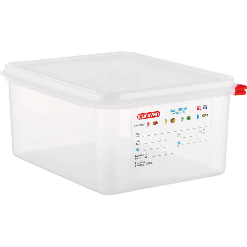 Pojemnik GN 1/2 HACCP z polipropylenu z pokrywką. Pojemnik wykonany jest z półprzezroczystego polipropylenu nie absorbującego zapachów wolnego od Bisfenolu. Pojemnik wyposażony jest system ColorClip, jest to zestaw kolorowych klipsów do oznaczania pokrywy i pojemnika w zależności od produktów w nim przechowywanych. Pojemnik wyposażony jest w etykietę ułatwiającą spełnianie norm HACCP, do wypełnienia markerem zmywalnym w zmywarce lub 96% spirytusem. Pojemniki charakteryzują się odpornością termiczna od -40 do 95oC. Pojemniki GN można piętrować dzięki czemu zajmują mniej miejsca podczas przechowywania. Nadają się do używania w kuchenkach mikrofalowych oraz mycia w zmywarkach gastronomicznych.