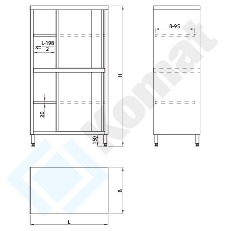Dno szafki znajduje się 150 mm od podłożanogi wykonane są z profili 40x40x1,2 i zakończone są stopą regulowaną z tworzywa Poliamid PA6 lub stopą regulowaną nierdzewną korpusy szaf wykonane są z blachy o grubości 0,8 lub 1,0 mm półki mają grubość 30 mm i wykonane są z blachy o grubości 0,8 lub 1,0 mm i mogą być usztywnione profilem metalowym drzwi wykonane są z blachy o grubości 0,8 lub 1,0 mm w formie puszki (podwójne ściany) o grubości 20 mm i mogą być dodatkowo usztywnione w środku profilem metalowym.