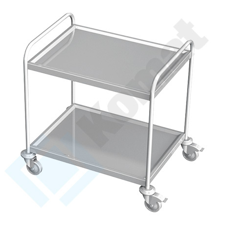 Wózek kelnerski , wykonany ze stali nierdzewnej chromowo-niklowej AISI 304; 1.4301 nierdzewnej i kwasoodpornej . Zastosowane rozwiązania konstrukcyjne zapewniają stabilność i wytrzymałość wózka (profil 40x40 i blachy 0,8-1,5mm) oraz funkcjonalność i łatwość utrzymania czystości.Przy stopach, wózka montowane sà koła o Ø 100 lub Ø 125, w tym 2 sztuki z hamulcem. Koła mają bieżni´ z pełnej gumy o twardości wg Shora A80 w kolorze niebieskoszarym, które mogą przenosić obciążenie max 800N.